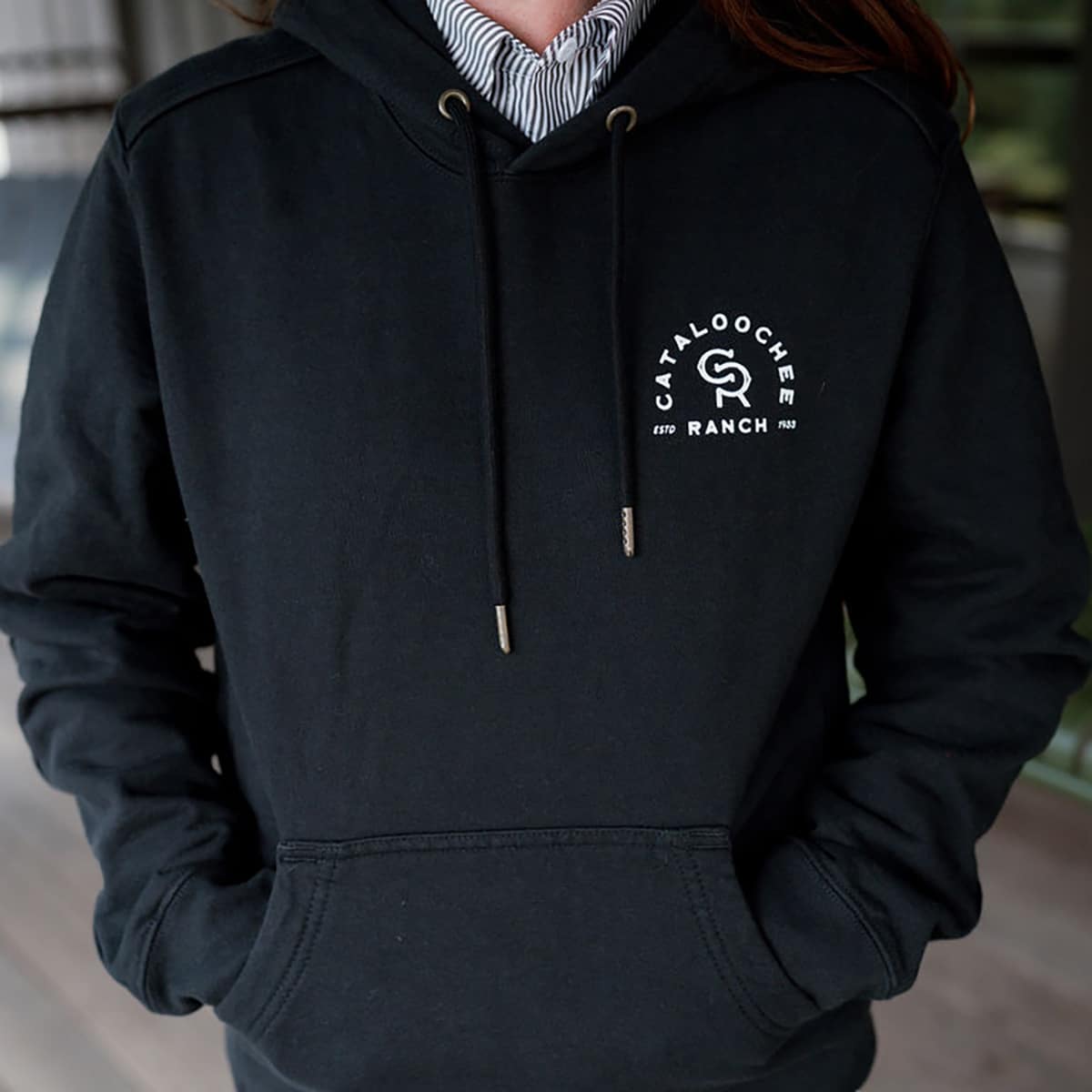 Our Cataloochee Ranch hoodie offers exceptional warmth, weight, and durability without sacrificing comfort. Crafted from 100% combed ringspun cotton, the fabric is knit in Clover, South Carolina and sewn in Middlesex, North Carolina—a true Southern original from thread to finish. Details like reinforced elbow patches, a double-lined hood, and custom metal grommets ensure this hoodie stands up to daily wear, whether you're gathering around the fire pit or greeting the morning mist on horseback.