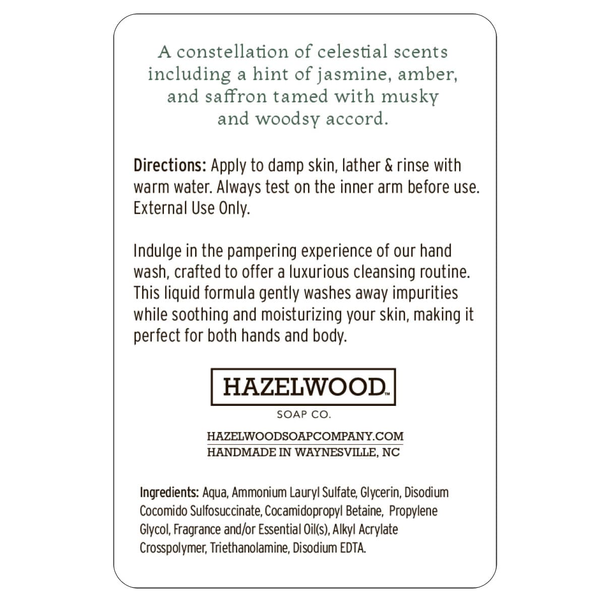 Elevate your daily cleansing ritual with Hazelwood Soap Companyβs gentle liquid hand wash. Thoughtfully crafted with mild, skin-loving ingredients that won't strip your skin's natural moisture β it's perfect for even the most sensitive skin. Immerse yourself in a celestial blend of fragrances: delicate jasmine, warm amber, and exotic saffron, harmonized with musky, woodsy undertones that evoke peaceful mountain evenings.