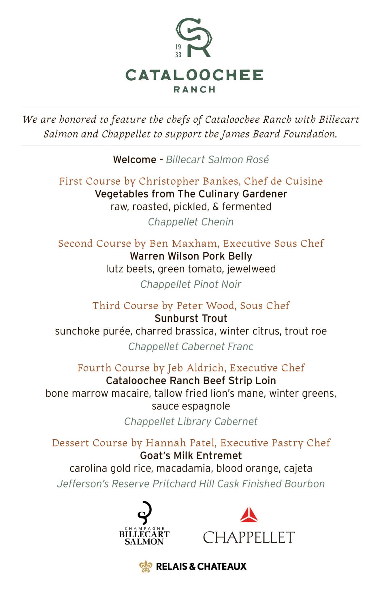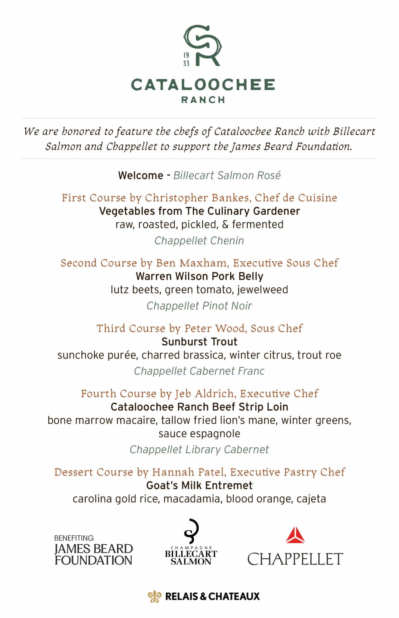We are thrilled to host this supper for the James Beard Foundation and invite you to join us for an evening of delicious cuisine, perfectly paired wines, live music, and the company of great friends and neighbors. Enjoy each chef of Cataloochee Ranch’s signature dish, and adventurous wine (or non-alcoholic) pairing by our Level 3 Sommelier & Wine Director, Cara De Lavallade. This will be a night to remember that not only pleases the tastebuds, but benefits the ongoing support, education, and opportunities of chefs and culinary professionals through the distinguished James Beard Foundation.